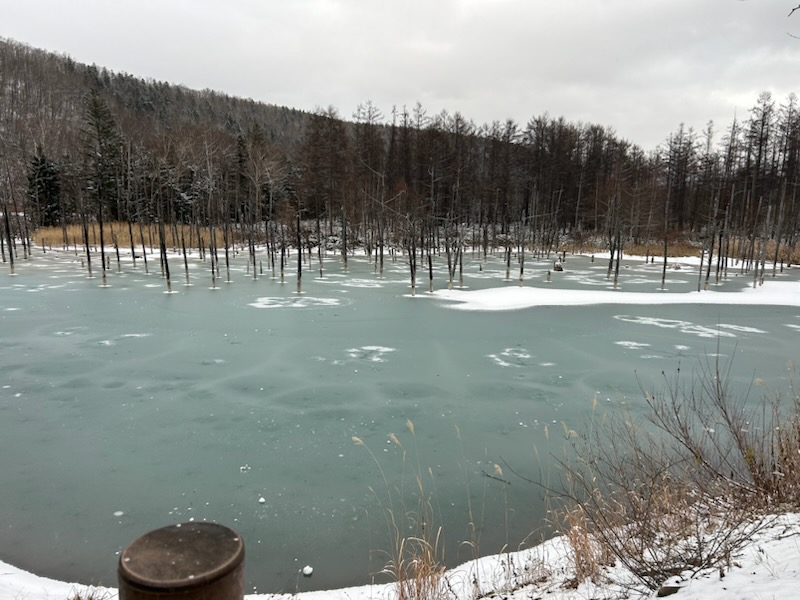 雪が降った後の青い池。 早朝の気温も下がり、池の水も凍り始めると雪が池の氷の上に積もり池の青い色が見えなくなってきますよ・・・! |